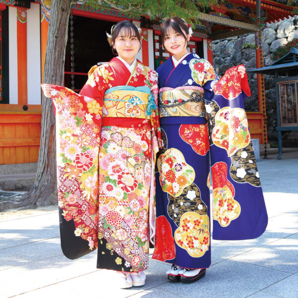 成人式 姉妹で振袖 妹 振袖持ち込み 小物レンタル ¥140,000- (成人式当日の着付け込み) コメント: 振袖はお持ち込みで、着物に合わせてヘアセットさせていただきました。 姉 振袖レンタル \15,000- 着付け¥15,000- 小物サービス コメント: 妹様の成人式の記念にお姉様は落ち着いた濃紺の振り袖をレンタルいただきました。 王道の古典柄に今っぽさのある帯締めで。 PREV